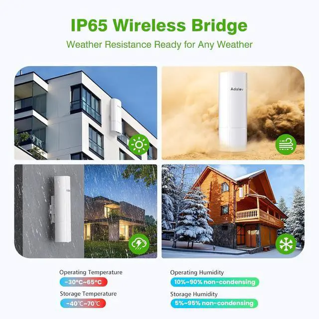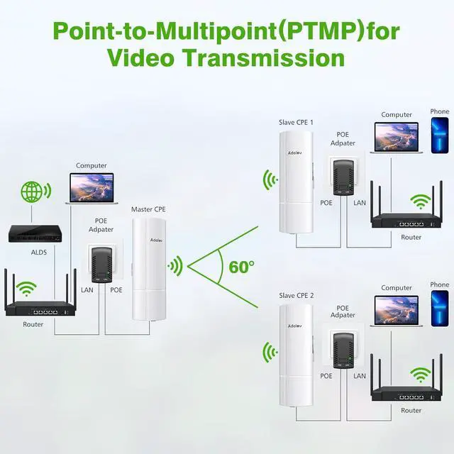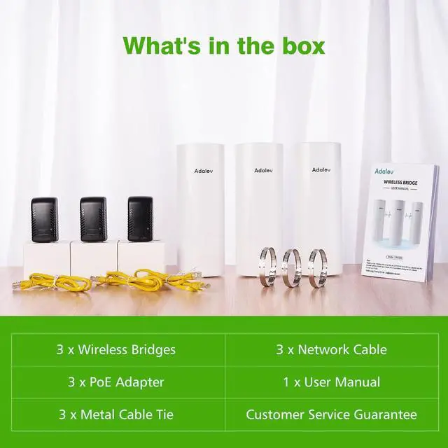 Three-Piece Kit for Versatile Connectivity: The Adalov CPE369 kit includes three wireless bridges, offering flexible connectivity options with both 100Mbps and 1000Mbps ports for diverse network needs, enabling point-to-point or point-to-multipoint connections, ideal for extending network coverage to multiple locations