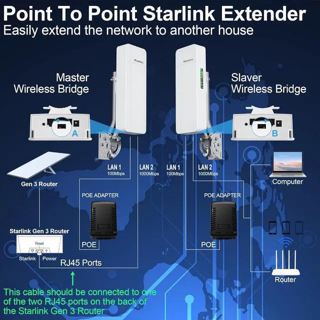 [Compatibility with Starlink Router] : This wireless bridge outdoor can be connected to the LAN port of a Starlink router to extend the Starlink network signal to another location. It cannot receive satellite signals by itself, nor can it replace the Starlink antenna.