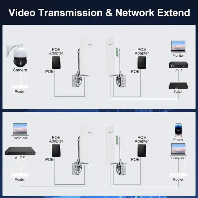 [Operating Frequency and Advantages] : This WiFi bridge operates on a 5.8GHz frequency band. Compared with the common 2.4GHz band, this frequency band has less interference, providing a more stable and clean signal, which is suitable for point-to-point transmission.