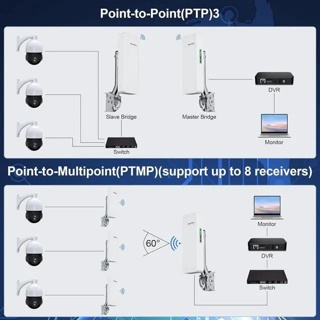 [IP65 Waterproof Rating] : An IP65 waterproof rating means the point to point wireless bridge can be installed outdoors and withstand rain and snow. However, it does not mean the device can be submerged in water or exposed to extremely harsh weather for a long time.