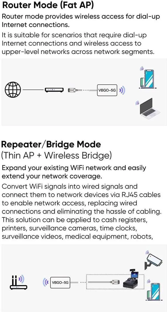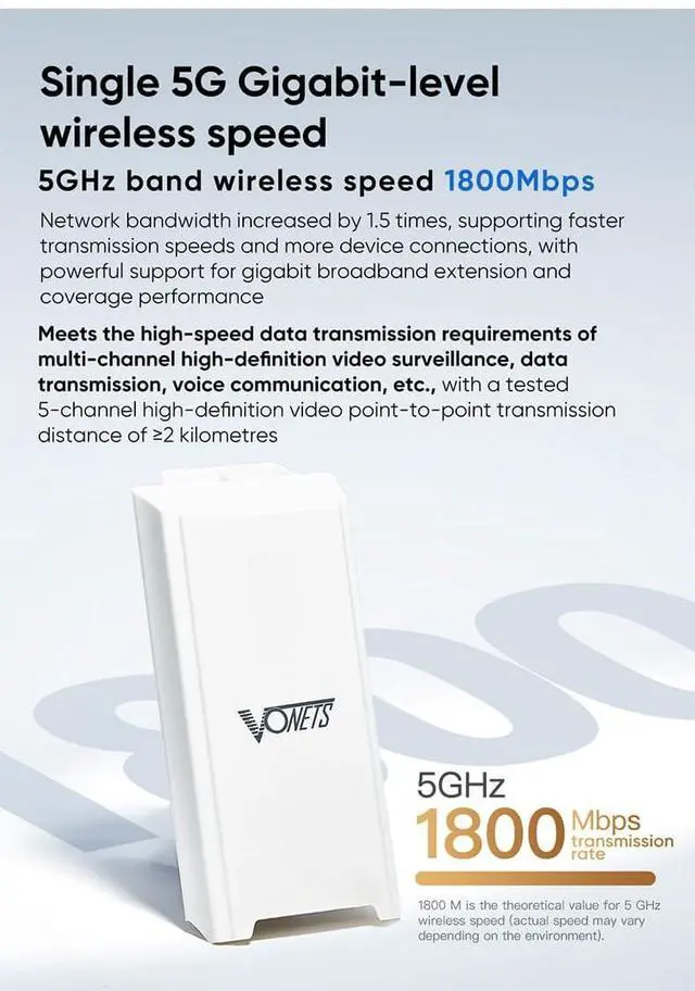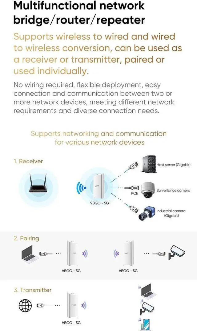 What VBGO-5G is VONETS VBGO-5G is an Industrial 5GHz Gigabit Outdoor Wireless Bridge Router Repeater/AP, Point to Point Long Range WiFi Extender, WiFi to Ethernet Adapter, 5GHz Single band,1800Mbps, POE power, Dial pairing method for easy configuration, it supports Bridge/Router and AP modes, stable connections for various Wi-Fi transmission needs.
