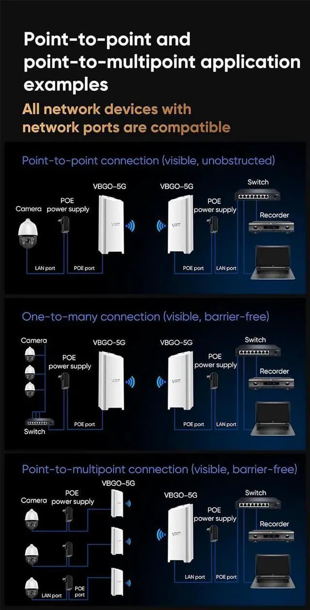 Versatile Operation Modes for Diverse Networks Supports multiple operation modes including Point-to-Point (PTP) and Point-to-Multipoint (PTMP) connections, perfect for extending surveillance networks or connecting IP cameras. Easily set up VBGO-5G with IP cameras and network DVRs for extended coverage, providing "eyes on" places you might not otherwise see. Ideal for elevator monitoring, security systems, and more.