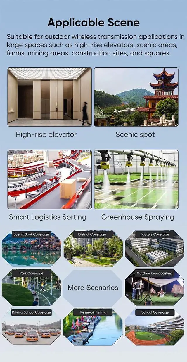 Extended Surveillance Camera Deep protocol optimization for wireless video surveillance transmission to ensure high-speed video transmission and smooth video surveillance and the underlying wireless driver is optimized in-depth, with stronger anti-interference ability and better stability. Support point-to-point and point-to-multipoint to expand your monitoring range