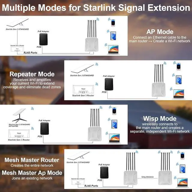 Multi-Function Modes: The WiFi extender for Starlink offers both AP (Access Point) and Repeater modes, allowing flexible expansion of an existing Wi-Fi network or the creation of a new wireless coverage area based on specific needs.