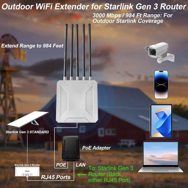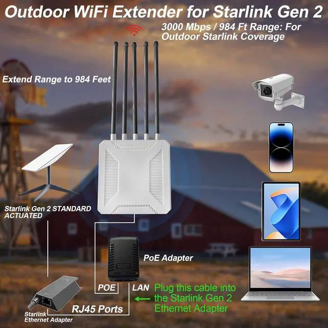 WiFi Extender Designed Specifically for Starlink Routers: This high-performance outdoor Wi-Fi 6 Signal Booster is designed to provide ultra-fast, wide coverage, and reliable wireless network connections for large indoor and outdoor spaces. It is perfect for expanding the signal coverage range when used with home routers and Starlink routers