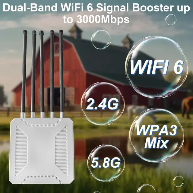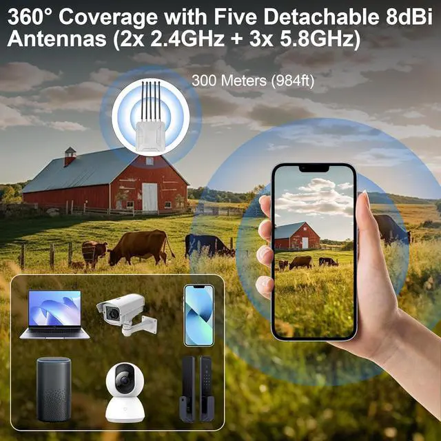 Wide Coverage: The long Range outdoor wifi extender for Starlink equipped with 5 x 8dBi high-gain antennas and advanced beamforming technology, the signal coverage can reach up to 200-300 meters, supporting over 200 devices simultaneously. It is ideal for large areas such as farms, estates, and campsites