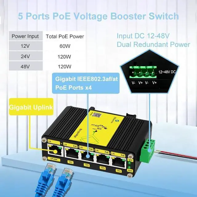 ./ : Support standard IEEE802.3af/at POE output with built-in voltage booster adn DC 12V-48V input.