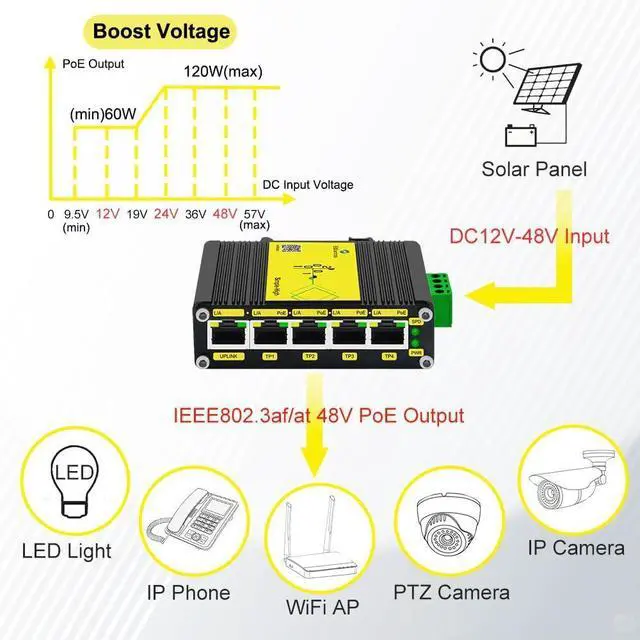 :Standard POE supply in RV/Vehicle/Truck/Bus (DC12V input), VoIP/Access control systems (DC24V input), solar power system (DC12V/DC18V/DC36V input).