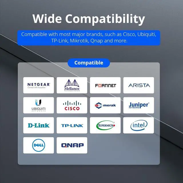 Compatible with Cisco, Meraki, Ubiquiti, Mikrotik, Intel, Fortinet, Netgear, D-Link, Supermicro, TP-Link, Quanta, Solarflare, PaloAlto, F5 and more brands.