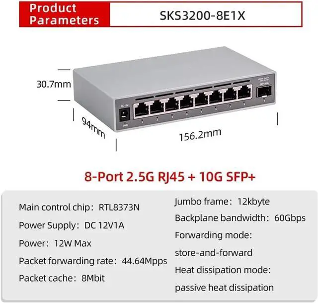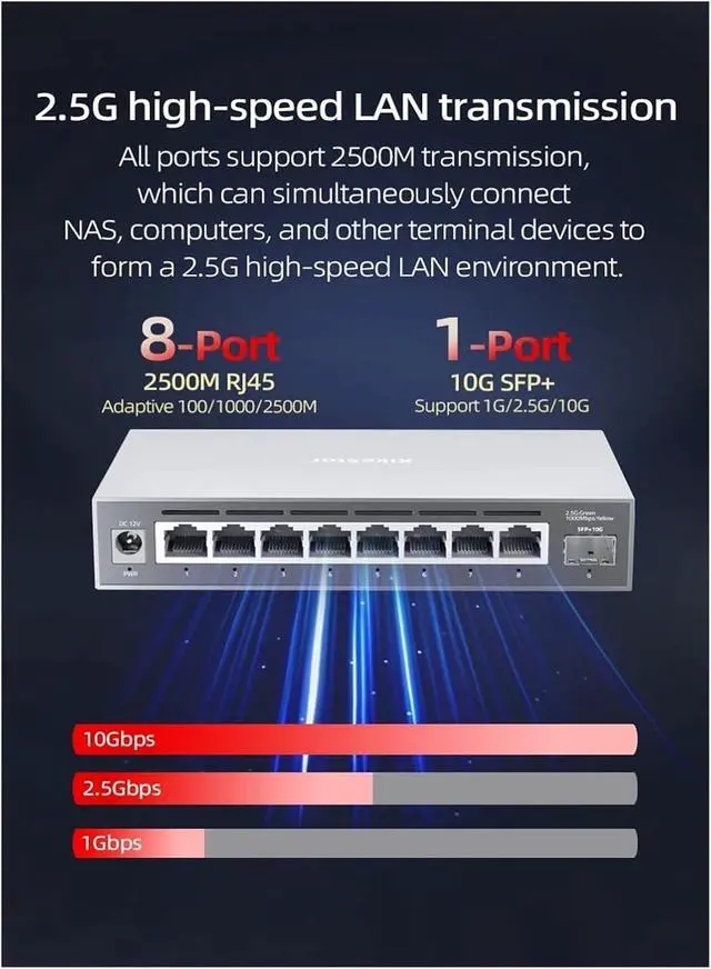 Equipped with 8× 2.5G RJ45 ports and 1× 10G s-f.p+ port, the switch supports full 1G/2.5G/10G transmission, offering ultra-fast, stable connectivity for home and business networks.