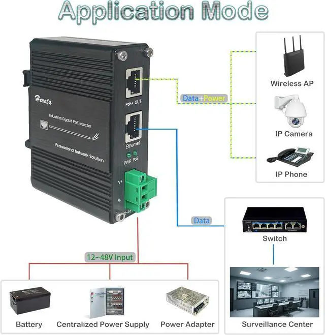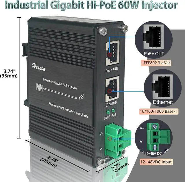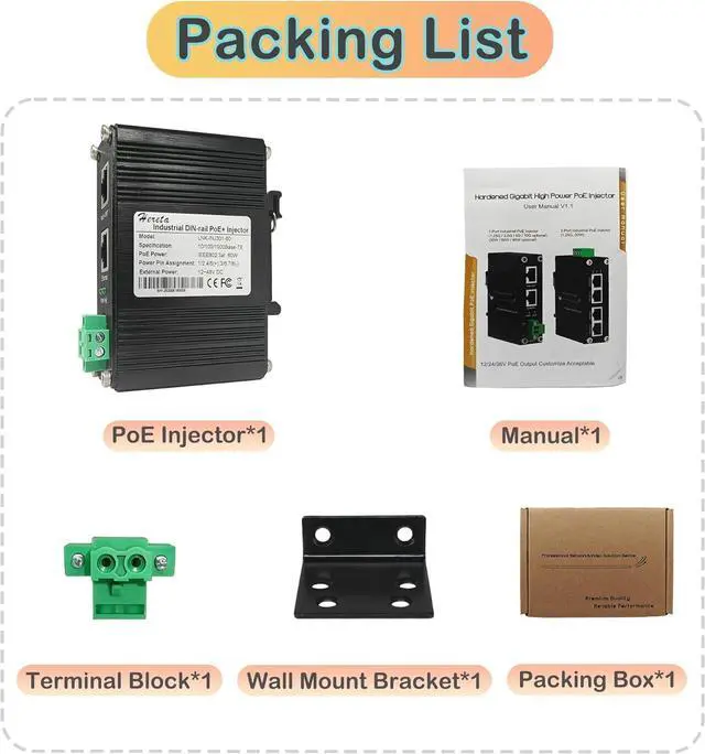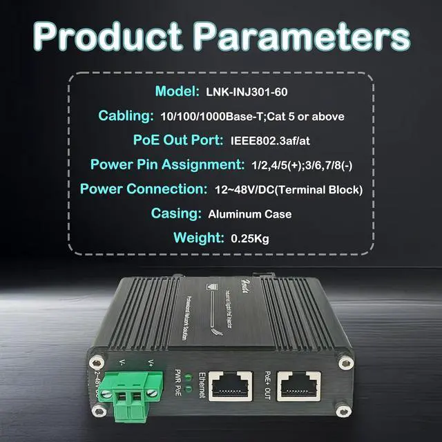 High Performance: The injector supports1 Gigabit (10/100/1000Base-T) date rate, meets IEEE802.3 af/at standard,providing up to 60W of power, which ensures fast and reliable data transfer while is sufficient for most PoE devices