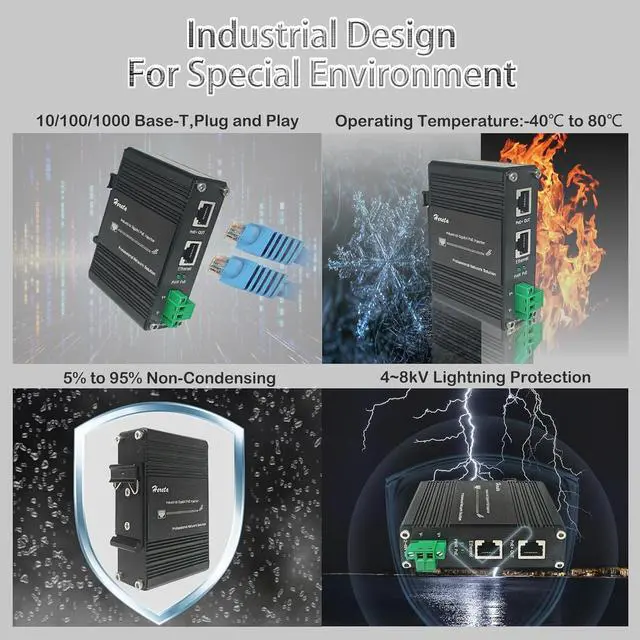 Industrial-grade Build Quality: The IP40 aluminum case is rugged and lightweight to withstand harsh conditions. It operates efficiently over a wide temperature range of -40°C to 80°C(-40°F to 176°F) and is suitable for a wide range of environments