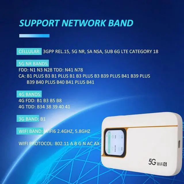Support Network Band: 5G NR: FDD: N1 N3 N28 TDD: N41 N78, CA: B1 Plus B3 B1 Plus B1 Plus B3 Plus B3 B39 Plus B41 B39 Plus B39 B40 Plus B40 B41Plus B41, 4G band: TDD LTE: B34 38 39 40 41, FDD LTE: B1 B3 B5 B8, 3G band: B1. In addition, the portable hotspot has a built in 1T4R 5G antenna.