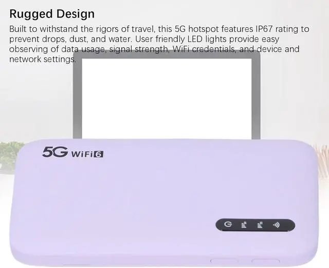 Rugged Design: Built to withstand the rigors of travel, this 5G hotspot features IP67 rating to prevent drops, dust, and water. User friendly LED lights provide easy observing of data usage, signal strength, WiFi credentials, and device and network settings.