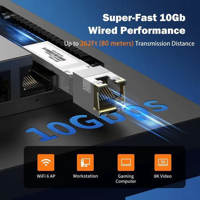 10Gb SFP+ to RJ45 Copper Module, Up to 262FtSupports 10GB/ 5GB/ 2.5GB data rate with CAT6A/CAT7 cable, copper RJ-45 connector, up to 262ft(80m) transmission distance. NOT Compatible with Brand HP, Dell, H3C, Aruba, Arista, Intel, Juniper, Brocade, Alcatel!