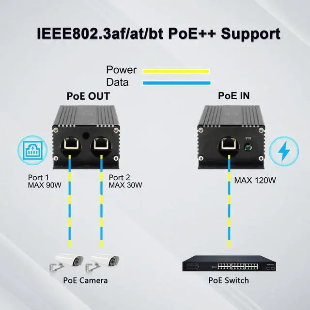 - : Extend Ethernet up to 400m (1,312ft) with 1-in 2-out ports, supporting 90W input and IEEE 802.3af/at/bt standards for seamless power and data delivery.