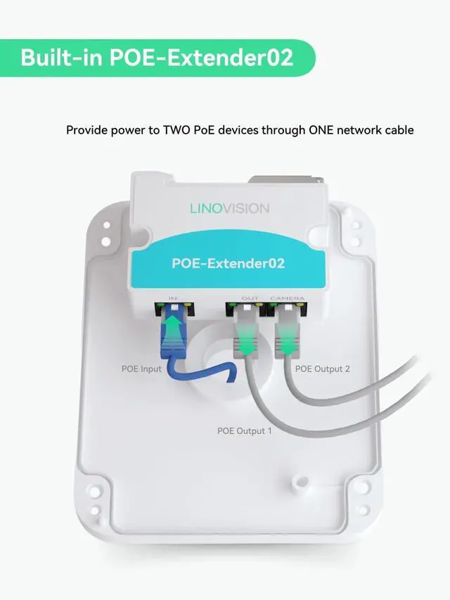 BUILT-IN 2 PORTS PoE EXTENDER - It can power two PoE cameras through one network cable, much easier for cabling.