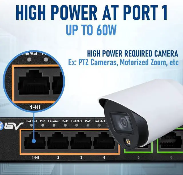 Hi-PoE at port 1 providing up to 60W single port, PoE+ at port 2-4 up to 30W per port, which is better than normal PoE port that can only provide 15.4W per port. 60W Max Total Power (includes 60W DC adapter).