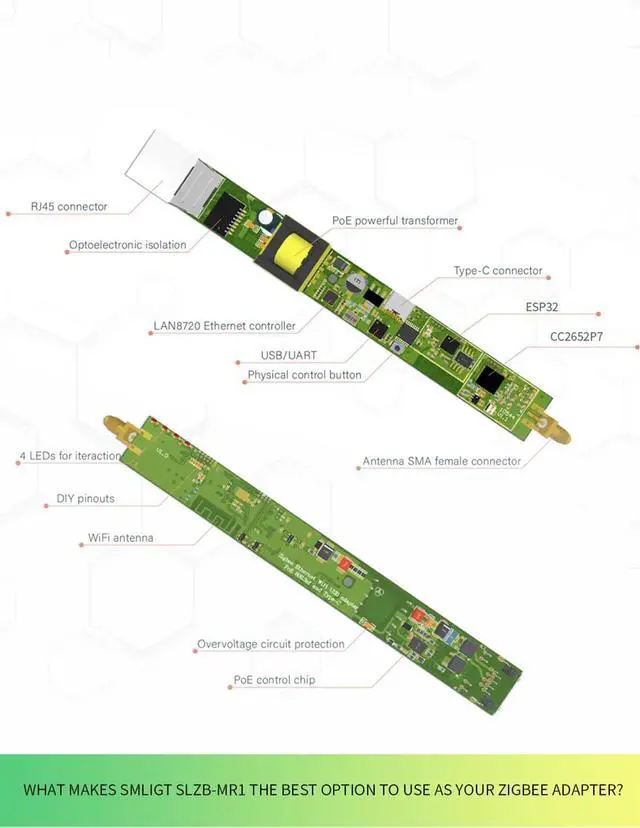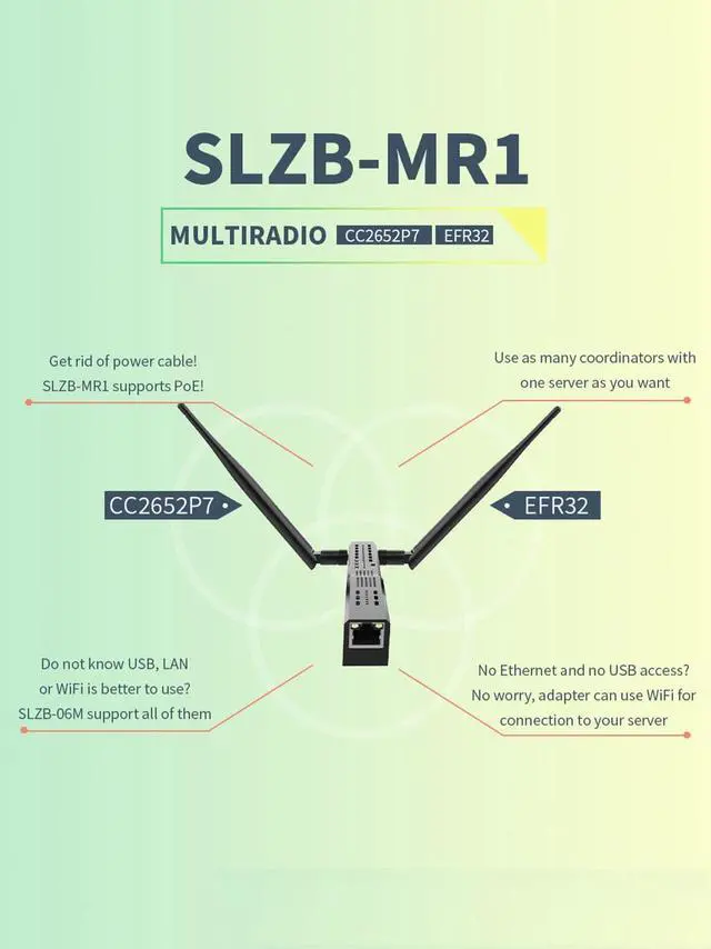 3ModesZigbee-to-Ethernet, Zigbee-to-WiFi and Zigbee-to-USB Matter-over-ThreadSLZB-MR1 has also experimental supports of Matter-over-Thread.Different Zigbee SoCs OptionsSLZB-06 on CC2652P,SLZB-06M on EFR32MG21.Plug-and-playPre-flashed and ready to use with Zigbee2MQTT and ZHAPowering PoE and Type-C powering, PoE IEEE 802.3af standard support.Firmware OTA updateZigbee and Core firmware OTA update over web-interface (one-click update).Most powerful chipMost powerful version of ESP32 chip inside: 2 cores @ 240Mhz + 16Mb memory.Double protectionVPN tunneling with Home Assistant and security authorizations.VPN tunneling with Home Assistant and security authorizations. Securely protected login with password to web-interface, internal whitelist firewall settingsMulti-Building CoverageCan cover multiple buildings with 2 or more coordinators and Zigbee2MQTT. You can install as many coordinators to work with Zigbee2MQTT+Home Assistant as you want.Support multiple languages15 language localization interfaces.Zigbee firmware/Core firmwareCoordinator or Router Zigbee firmware/ Standard or Opensource Core firmware.Rich packingZigbee Coordinator, +5dB antenna, screws and screwdriver, adhesive tape, Type-C adapter, manual. Which Zigbee chip should i choose?