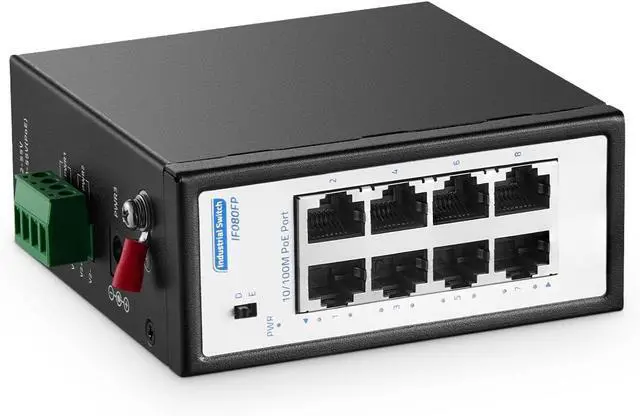 8 Port PoE+ Industrial Switch: This network switch includes 8 Ports PoE+ IEEE802.3af/at/HiPoE, 10/100Mbps Fast Ethernet, DIN-Rail & Wall Mount Included.