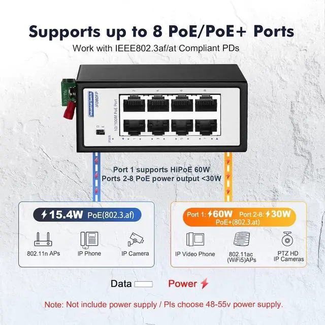 NOTE: The poe port 1 supports HiPoE 60W, the poe port 2-8 support IEEE802.3af/at standard, max 30W per port, can connect multiple poe devices, such as POE camera, poe ap, etc. Please note that passive 24v poe is not supported. His POE input DC voltage is 48-55V, so please use a input voltage above 48V to provide POE, if it is 12V, it cannot provide POE.