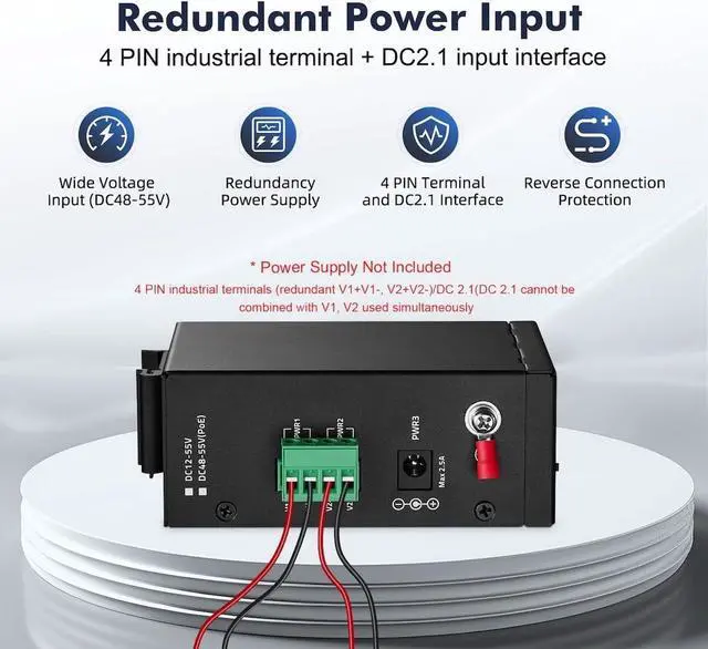 Redundant Power: 1 DC Power and 2 Industrial power(4 pin terminal), total of 3-way power supply is more flexible. Automatic fault switching, anti-reverse connection does not damage the equipment, higher reliability. ***Please note that the power adapter is not included***
