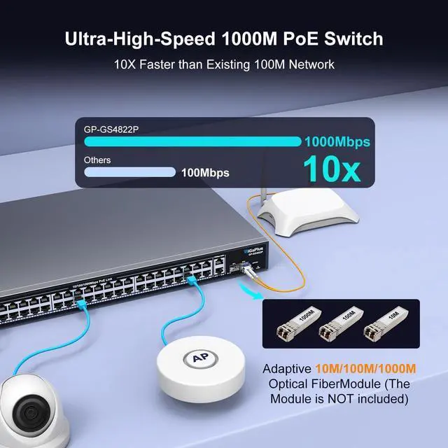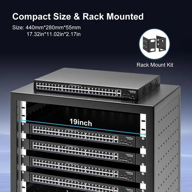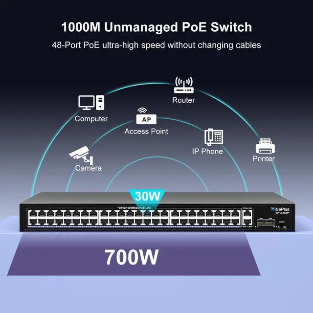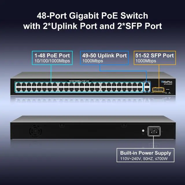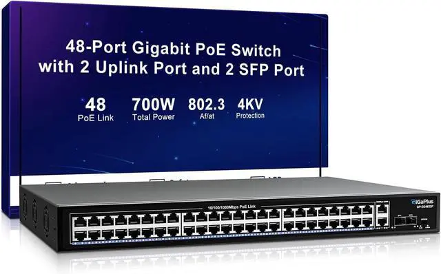 48 Port Gigabit PoE+ Switch: This 48-port Gigabit PoE+ switch features 48 PoE+ RJ45 ports and 2 Gigabit uplink, 2 Gigabit SFP ports for connecting to NVRs, the Internet, and more. With high-speed data transmission and power delivery over the network cable, it offers a reliable solution for your devices.