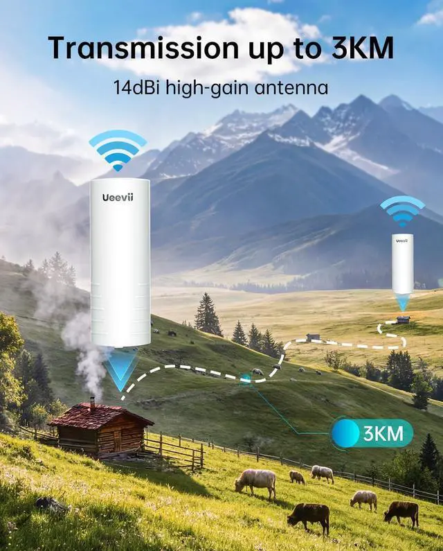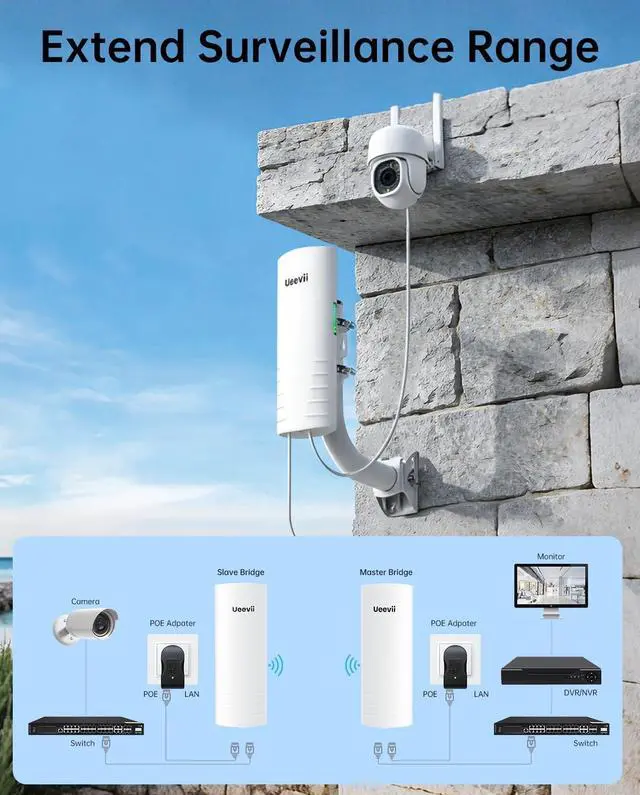 EXTENDED SURVEILLANCE RANGE: Connect IP cameras wirelessly for lane, yard, warehouse, farm, and house monitoring without wiring and buried wires, saving manpower and material resources.