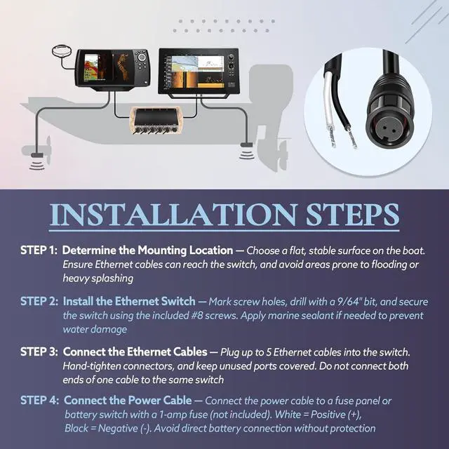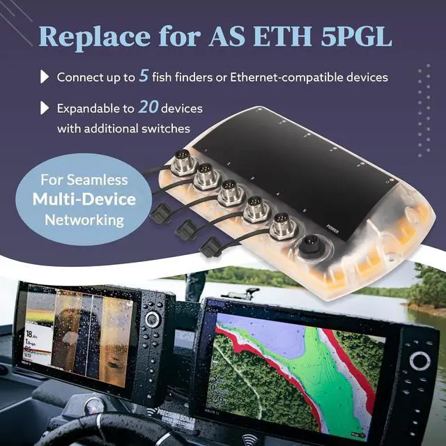 Seamless Multi-Device NetworkingConnect up to 5 fish finders or Ethernet-compatible devices to share sonar, GPS, and radar data in real time. Expandable to 20 devices with additional switches, ideal for building a professional marine network without data loss