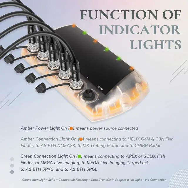 Function of Indicator LightsConnection Light: Solid = Connected; Flashing = Data Transfer in Progress; No Light = No Connection. Amber Connection Light: for HELIX G4N & G3N, for AS ETH NMEA2K, for Minn Kota Trolling Motor, Radar. Green Connection Light: for APEX, for SOLIX, for MEGA Live, for TargetLock, for AS ETH 5PXG, for AS ETH 5PGL. Amber Power Light: Connected to power