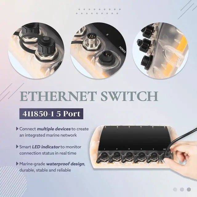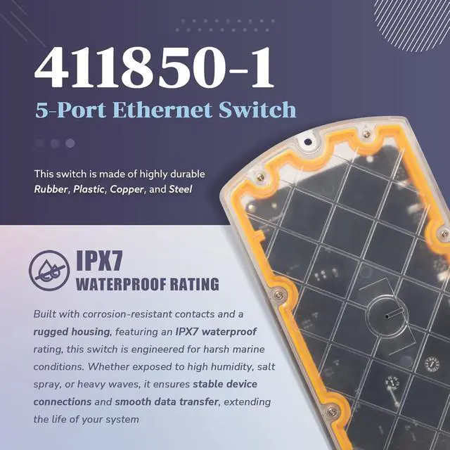 Marine-Grade DurabilityThis 411850-1 5 Port Ethernet Switch is built with corrosion-resistant contacts and a rugged housing, featuring an IPX7 waterproof rating, this switch is engineered for harsh marine conditions. Whether exposed to high humidity, salt spray, or heavy waves, it ensures stable device connections and smooth data transfer, extending the life of your system