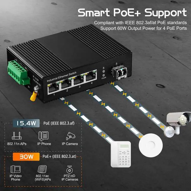IEEE802.3af/at PoEPort 1-4 support IEEE802.3af/at standard, max 30W per port, connect multiple poe devices, such as POE camera/ap, etc. Not support passive 24v poe. His POE input DC voltage is 48-55V, please use a input voltage above 48V to provide POE, if it is 12V, it cannot provide POE