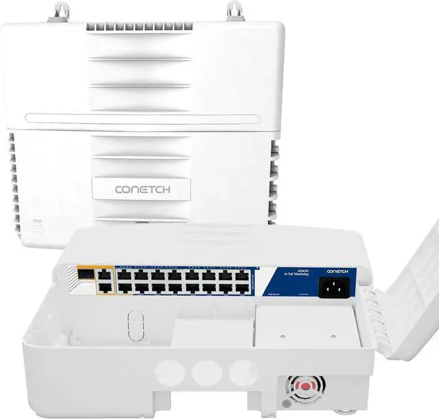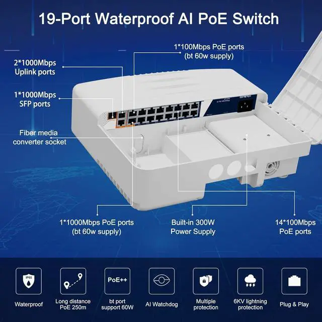 19 Port Outdoor PoE Switch: 15 x ( PoE+ ) 10/100 Mbps RJ45 ports, 1 x (PoE++) 10/100/1000 Mbps RJ45 port, 2 Gigabit Uplink Ports, 1 Gigabit SFP Port, 300W built-in power supply, Input Voltage Range 90~240V; Port 1~15 Transmission Distance ( 10/100Mbps 130meters; 10Mbps Auto-adaption 250meters); Port16 Transmission Distance( 10/100/1000Mbps 130meters).