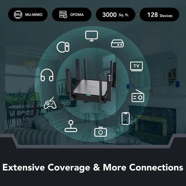 Multi-user-friendly Design: This Wi-Fi 6 Wireless Router supports the 802.11ax Wi-Fi standard, allowing many users to share channels and connect up to 128 devices, increasing network capacity and efficiency in congested areas. Easily address the party's multi-device dilemma.