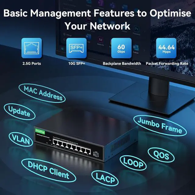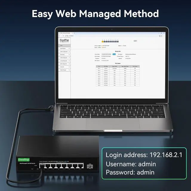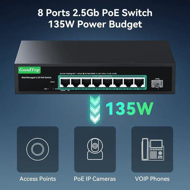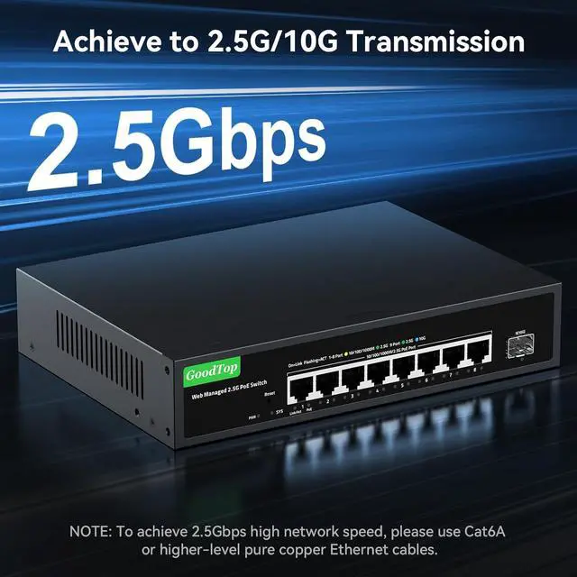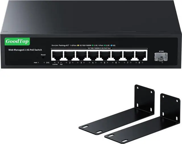 2.5gb SwitchThe switch is equipped with 8×2.5G PoE ports and 1×10G SFP+ slots. 2.5G ports support 10/100/1000/2.5G adaptive speed and Auto MDI/MDIX. 10G SFP+ slots are compatible with GoodTop RJ45 copper modules, optical fiber SFP+ modules, 10G DAC, and AOC cables. (Note: The 10G SFP+ ports might not support special GPON/XGSPON modules from some Internet Service Providers.)