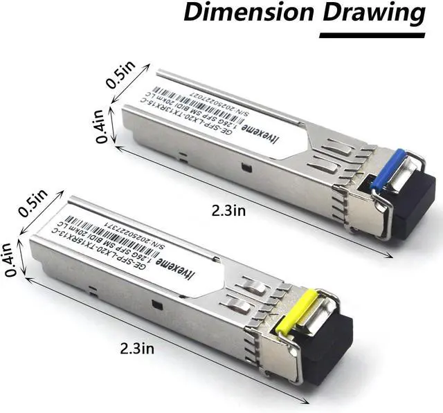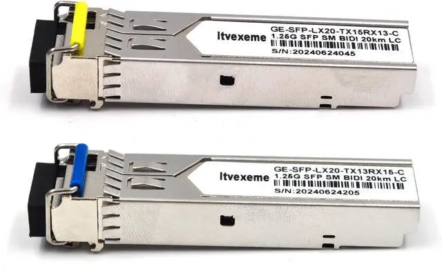 1000Base-BIDI SFP: 5 Pairs Gigabit Single Mode SFP Bidi Transceiver, SMF, Single LC connector, Wavelength: (Blue: TX1310nm/RX1550nm; Yellow: TX1550nm/RX1310nm); Gigabit SFP Module support 1.25Gbps data rate over single-mode Single LC fiber cables up to 20 km