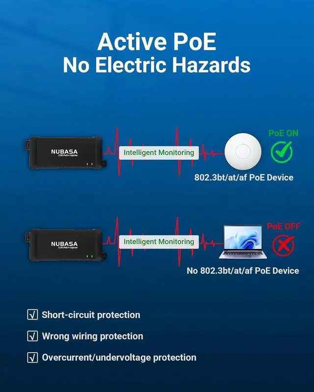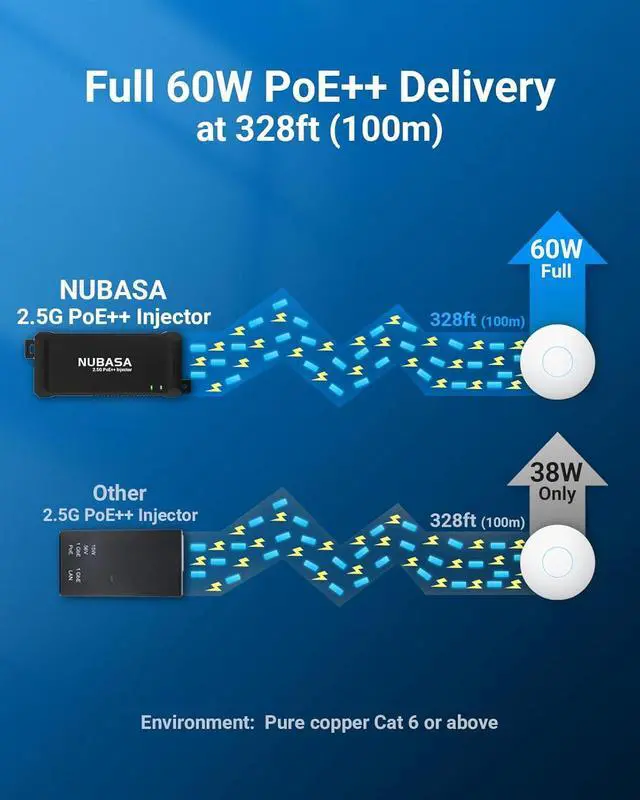 Reliable Power Delivery Up to 328ft with Line Loss CompensationThis 60W PoE injector uses advanced voltage regulation helps maintain stable power output even at long distances (up to 100 meters), reducing the risk of device reboots due to voltage drop over extended cable runs.