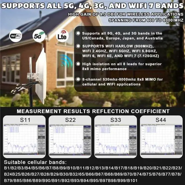 Full-Band High-Performance Antenna: Features an 8X8 MIMO cross-polarized design with a gain of up to 10dBi, covering an ultra-wide frequency range of 600-8000MHz. Supports all global communication standards, including 3G/4G/LTE/5G NR/5GA and WiFi 6E/7. Patented MIMO technology significantly enhances signal quality, making it fit for outdoor and RV camping use. Includes 8 professional 2.2-meter low-loss LMR240 equivalent cables and offers 3 interface options: SMA Male, TS9, and RP-SMA