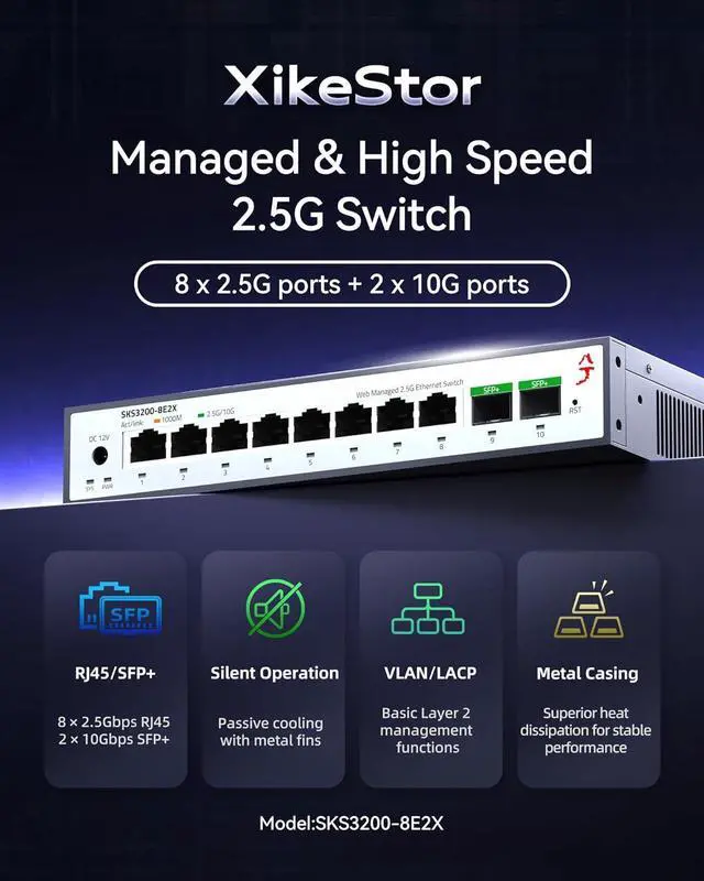 High-Performance 2.5G & 10G Connectivity This 8 port 2.5gb switch features 8 auto-adaptive RJ45 ports (100M/1G/2.5G) and 2 10G SFP+ ports supporting 1G/2.5G/10G speeds. The SFP+ ports are compatible with various transceivers, DAC, and AOC cables, allowing seamless integration into high-speed networks.