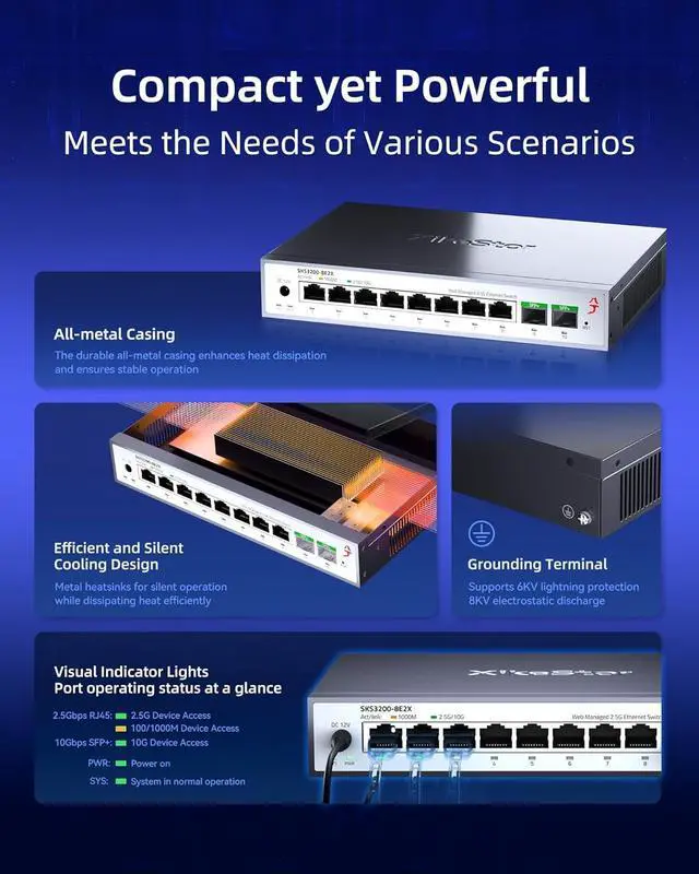 Reliable Protection & Wide Compatibility Built with 6KV lightning protection and 8KV ESD shielding, this 2.5gb managed switch ensures long-term network stability even in challenging conditions. Its perfect for WiFi 6 APs, 2.5G NAS, 2.5G servers, gaming PCs, printers, and security cameras, offering a robust and future-proof networking solution.
