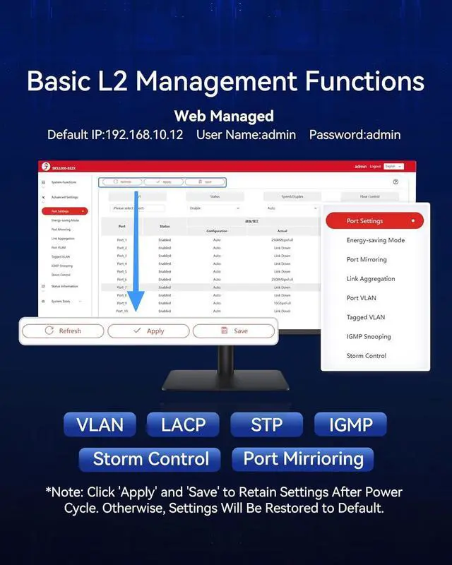 Advanced Layer 2 Management for Network Optimization As a 2.5g managed switch, it includes essential L2 features like VLAN, link aggregation (static & LACP), loop prevention, IGMP snooping. Its intuitive web-based management makes it a professional yet user-friendly managed network switch for homes, small offices, and business setups.