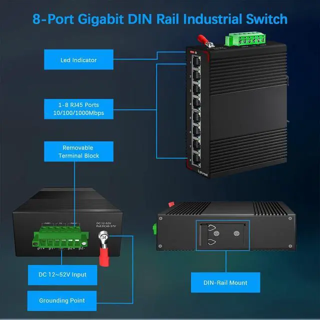 8 Port Industrial unmanaged Switch8× 10/100/1000Mbps ports,16Gbps switching capacity, support automatic detection, full/half duplex MDI/MDI-X adaptive. Please Note: equipped with one UL AC power supply adapter and one power cable, no need to buy it separately.