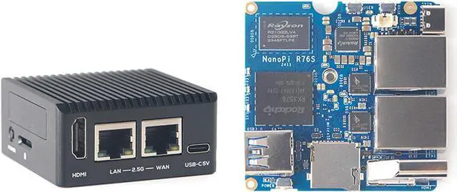 [Light NAS Video Play Router] NanoPi R76S (as R76S) is an open-sourced mini IoT gateway device with two PCIE 2.5G ethernet ports designed and developed. It is integrated with a Rockchip RK3576 CPU. It supports booting with TF cards and works with operating systems such as FriendlyWrt or OpenMediaVault etc. NanoPi R76S is a router featured with multiple Ethernet ports, light NAS and video playing. It is a cannot-miss platform with infinite possibilities for geeks, fans and developers.