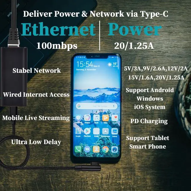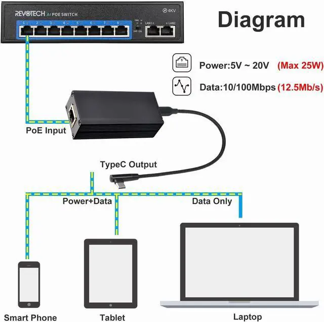 PoE to Type-C Convert 48V PoE output to Type-C (USB-C) output, supply power and Ethernet from USB C Por for smart phone/tablet. Plug and play without configuration