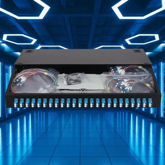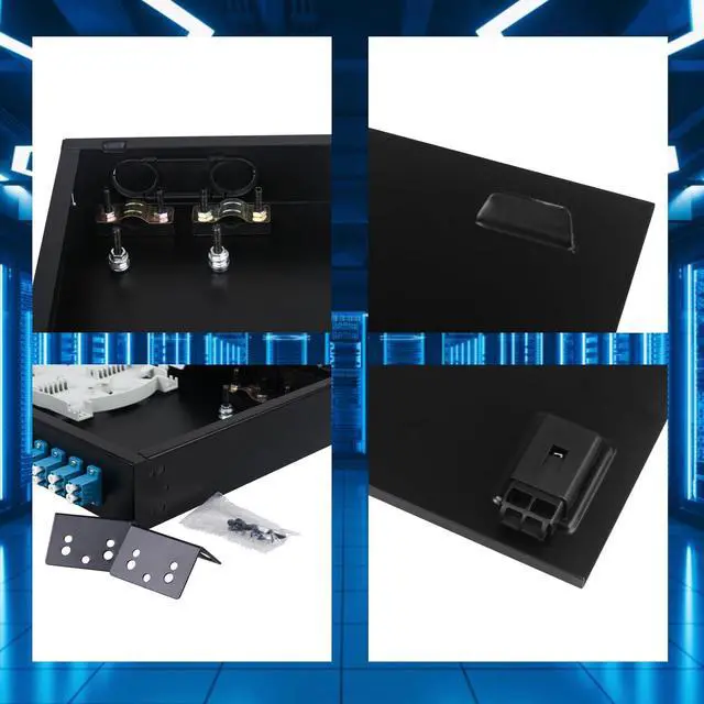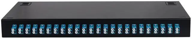 24 Duplex LC-UPC KitRack Mount Enclosure Box with Spool 12 Strands 1.2m LC Pigtail, Fiber Type 0.9mm 9/125 SingleMode G.625D; The snap on design allows for quick installation and maintenance. No need to tighten screws.