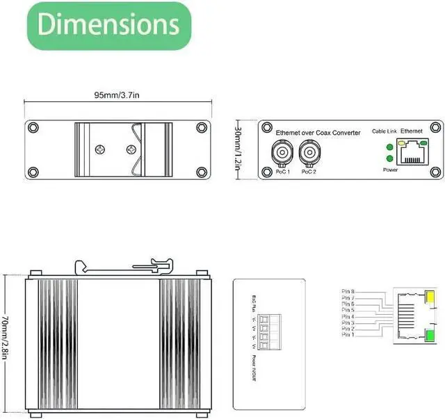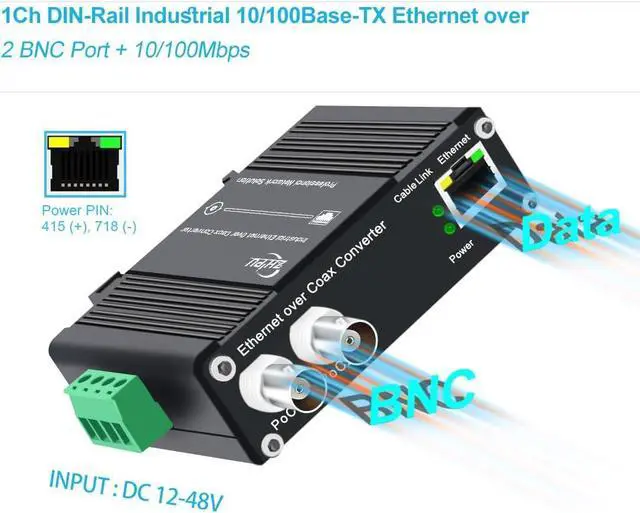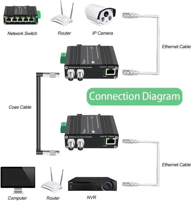 High-Speed Ethernet Extension:Transmit 10/100 Mbps full-duplex Ethernet signals up to 1200 meters over coaxial cable, CAT5e/6, or twisted pair, ideal for extending IP camera and NVR networks.