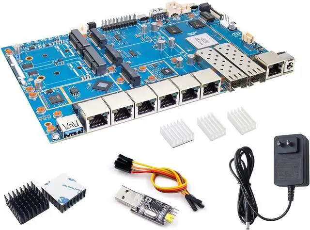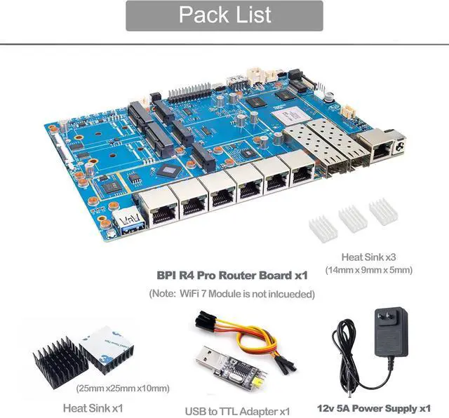 [2x 10Gbe SFP & RJ45/4x 2.5Gbe RJ45 LAN] Banana Pi BPI-R4 Pro wireless dual-band wifi router board support 1x 10G RJ45 WAN/LAN Port, 2x 10Gbe SFP and 4x 2.5Gbe ethernet with 4 Port 10/100/1000Mbps RJ45 LAN Gigabit Ethernet port, also with USB3.2 and M.2 interface, support 4G LTE/5G cellular network module and M.2 2280 NVME SSD. Providing the fastest and most reliable network connection.