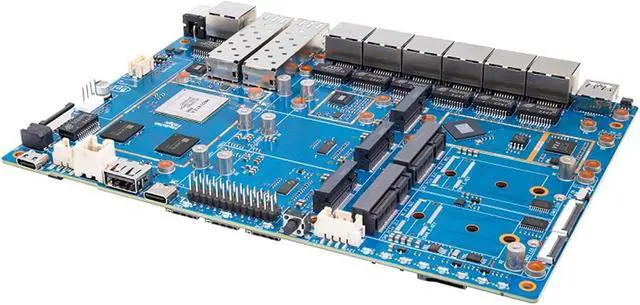 [Rich Peripheral interfaces] Banana Pi BPI-R4 wireless router board onboard 2x 10Gbe SFP Optical ports, 1x 10G RJ45 WAN, 1x 10G RJ45 LAN, 4x 2.5Gbe Gigabit LAN ports, 1x USB3.2 port, 3x Nano SIM Slots, 3x M.2 KEY-B connector for 5G/4G module, 2x M.2 KEY-M connector for M.2 2280 NVME SSD, 2x mini PCle slot for Wi-Fi NIC, 1x MicroSD Slot(TF), 1x Debug UART port, 1x 26 Pin GPIO header, supports UART, I2C, SPI, PWM, I2S.