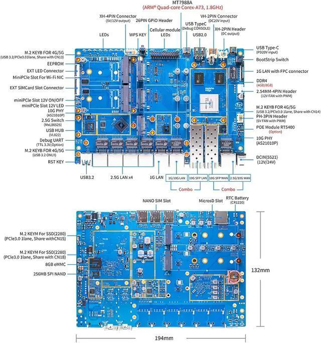 [MediaTek MT7988A (Filogic 880) SoC] Banana Pi BPI-R4 Pro 8X/4E Wiifi 7 OpenWRT Router Board with MediaTek MT7988A (Filogic 880) SoC (Quad-core ARM Corex-A73 CPU design), onboard 4GB/8GB DDR4 RAM, 8GB eMMC and 128MB SPI-NAND flash, works as 36Gbps Wi-Fi 7 access point/router/smart gateway. It is also a very high performance open source router development boards. It is an upgraded version of the BPI-R4 router board.