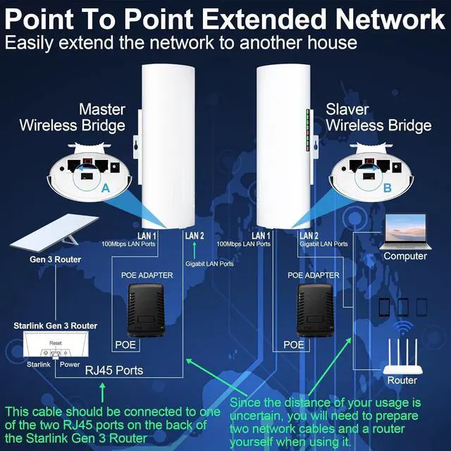 [High - speed Data Transmission for Starlink Internet]: We've adopted gigabit ports. However, due to the influence of the bridging distance, the actual transmission speed for users when transferring data and accessing the Internet is approximately 200Mbps. Nevertheless, whether it's downloading large files, streaming HD videos, or playing online games, a smooth and fast experience is guaranteed.
